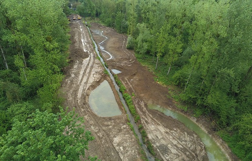 Les travaux ont commencé en février 2023 par la réouverture du milieu via l’abattage de la peupleraie mourante qui drainait la zone humide. Le lit rectiligne et encaissé à cause des curages répétés a ainsi été mis à nu. Au printemps, les travaux de terrassement ont visé à reméandrer le lit de la Nonette afin de lui permettre d’alimenter à nouveau efficacement les zones humides de fond de vallée, limitant le risque d’inondation.