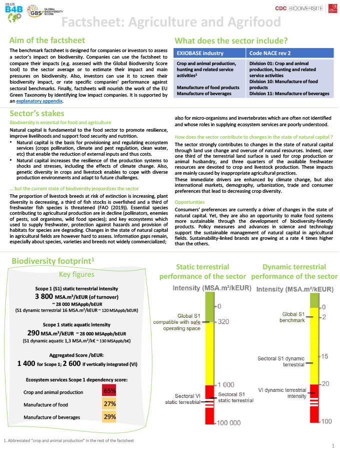 • La fiche sectorielle est un document de 4 pages condensant des informations sur les performances d’un secteur en matière de biodiversité. Elles fournissent des informations sur la contribution actuelle du secteur à la perte de biodiversité, sur ses performances, sa comparaison aux autres secteurs, sur la manière dont il sera affecté par la perte de biodiversité et sur les mesures qui peuvent être prises pour réduire son impact sur la biodiversité.