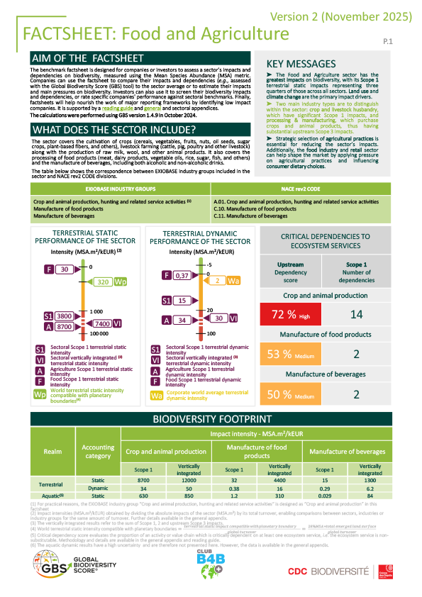 - La fiche sectorielle est un document de 4 pages condensant des informations sur les performances d’un secteur en matière de biodiversité. Elle fournit des informations sur la contribution actuelle du secteur à la perte de biodiversité, sur ses performances, sa comparaison aux autres secteurs, sur la manière dont il sera affecté par la perte de biodiversité et sur les mesures qui peuvent être prises pour réduire son impact sur la biodiversité.