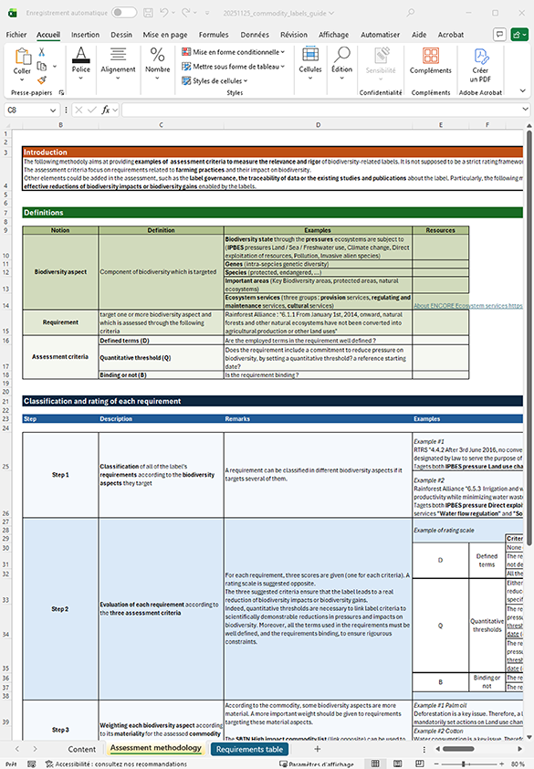 - Le guide d’analyse de labels sur des commodités agricoles présente une méthodologie d’évaluation des critères liés à la biodiversité de ces derniers. Quatre labels relatifs au soja, au cacao, à l’huile de palme et au coton sont ensuite évalués selon les critères définis dans la méthodologie. La grille d’évaluation peut être réutilisée pour analyser la robustesse scientifique et pertinence de labels agricoles du point de vue de la préservation de la biodiversité.