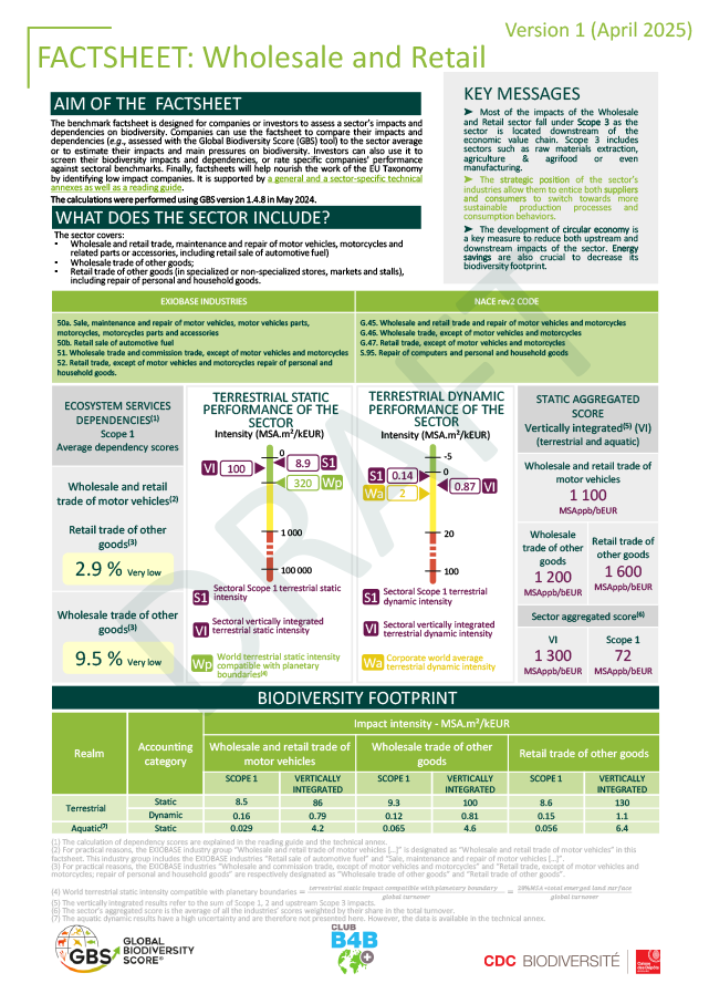 • La fiche sectorielle est un document de 4 pages condensant des informations sur les performances d’un secteur en matière de biodiversité. Elles fournissent des informations sur la contribution actuelle du secteur à la perte de biodiversité, sur ses performances, sa comparaison aux autres secteurs, sur la manière dont il sera affecté par la perte de biodiversité et sur les mesures qui peuvent être prises pour réduire son impact sur la biodiversité.
