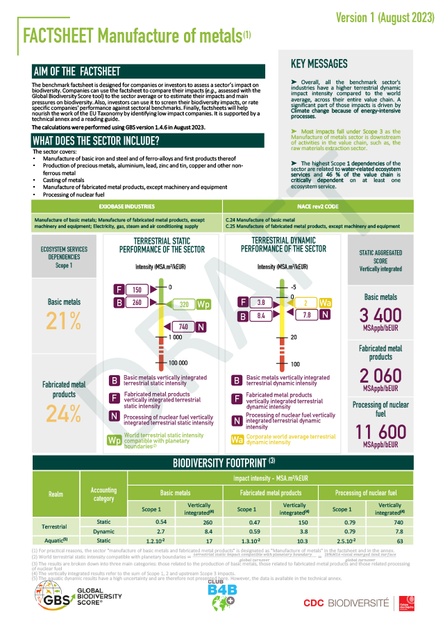 - La fiche sectorielle est un document de 4 pages condensant des informations sur les performances d’un secteur en matière de biodiversité. Elles fournissent des informations sur la contribution actuelle du secteur à la perte de biodiversité, sur ses performances, sa comparaison aux autres secteurs, sur la manière dont il sera affecté par la perte de biodiversité et sur les mesures qui peuvent être prises pour réduire son impact sur la biodiversité.