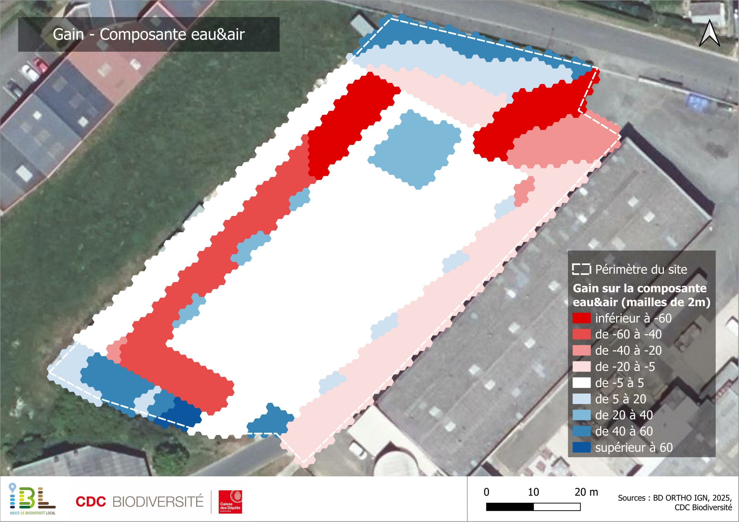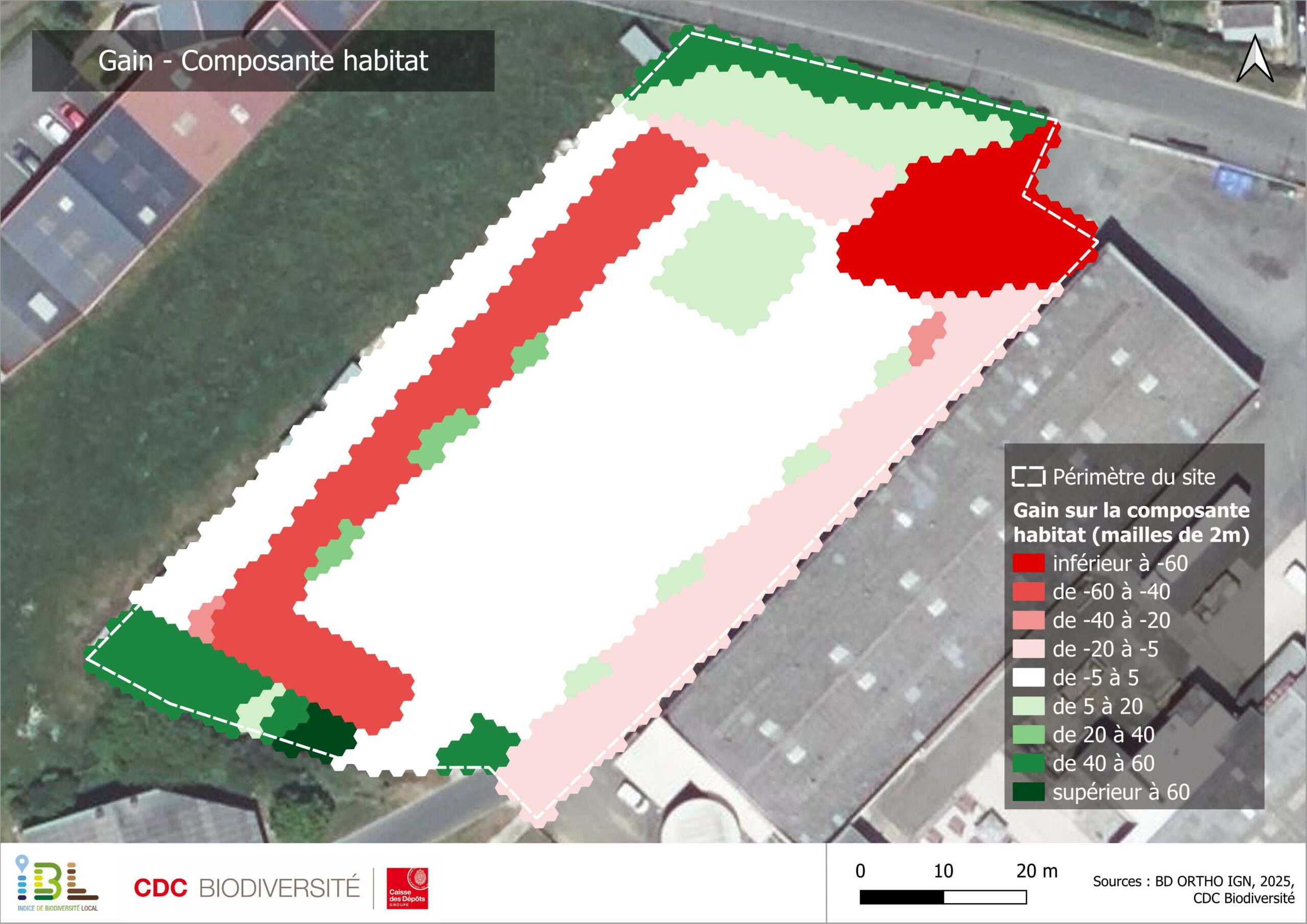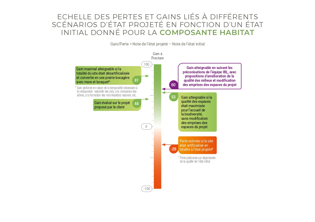 L’IBL permet de visualiser et comprendre l’impact des choix d’aménagement sur le site. Il propose de situer les gains ou pertes de biodiversité, spatialement et par rapport à différents scénarios de référence, et est accompagné de préconisations concrètes pour améliorer le projet.