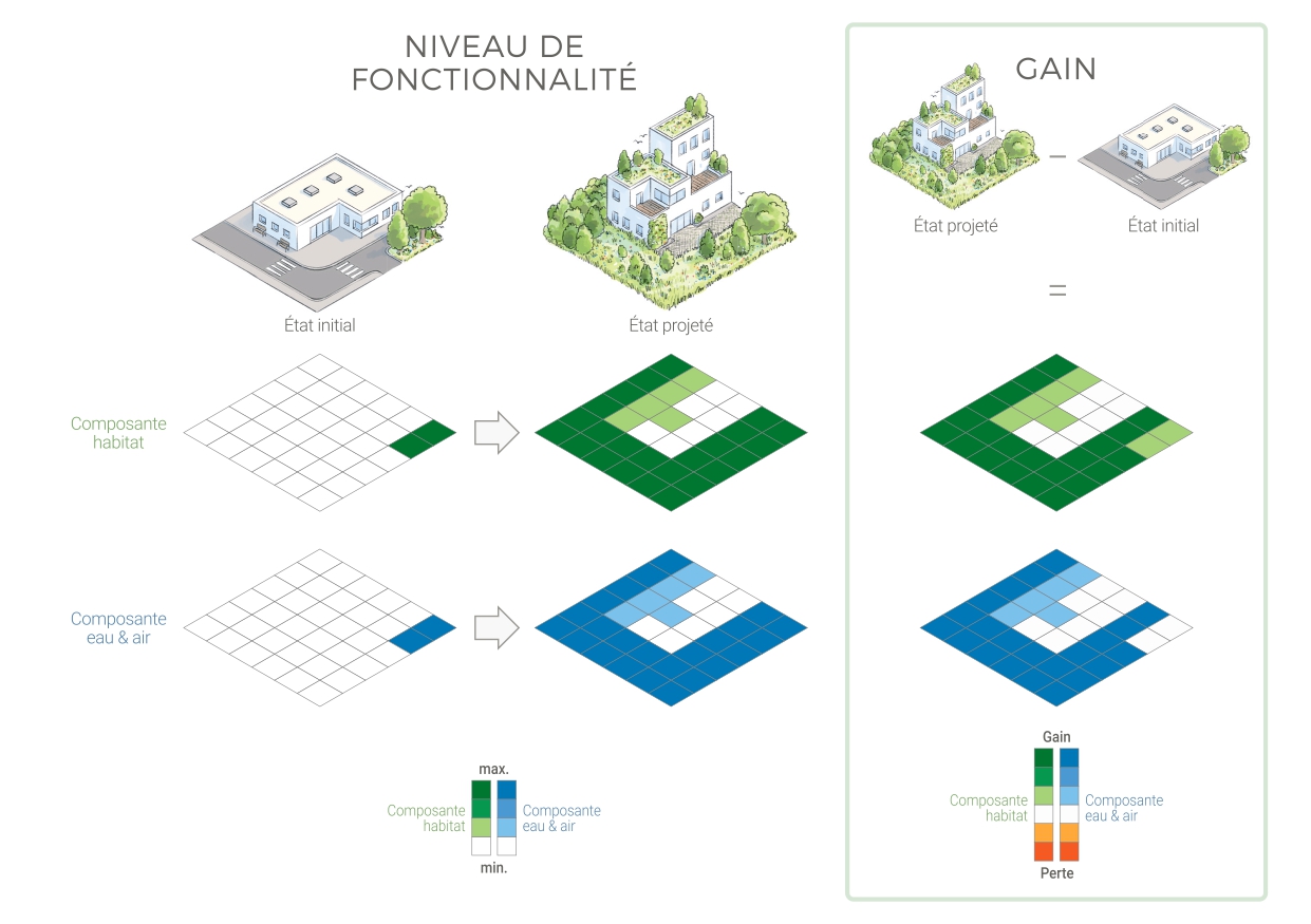 L’IBL évalue pour chaque composante, le niveau de fonctionnalité d’un site à l’état initial (avant-projet) et à l’état projeté (modélisation du site après aménagement). L’impact d’un projet est ensuite estimé via l’étude de la variation entre l’état initial et l’état projeté.