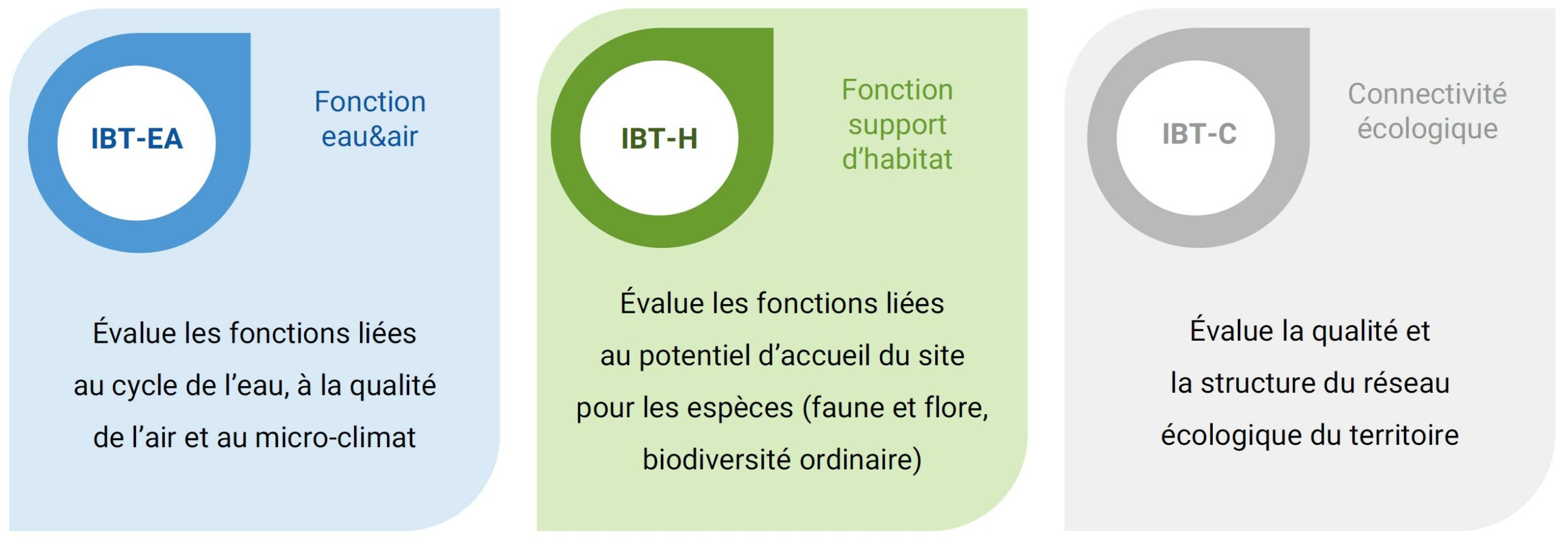 L’IBT compare l’état initial d’un territoire avec un état prédictif grâce au renseignement d’indicateurs validés par la communauté scientifique, sur la base de trois composantes complémentaires :