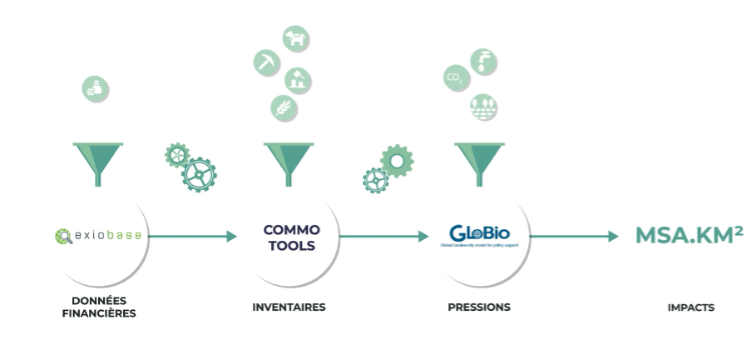 Links your economic activity to biodiversity pressures and converts them into impacts expressed in a single metric (MSA.km²).